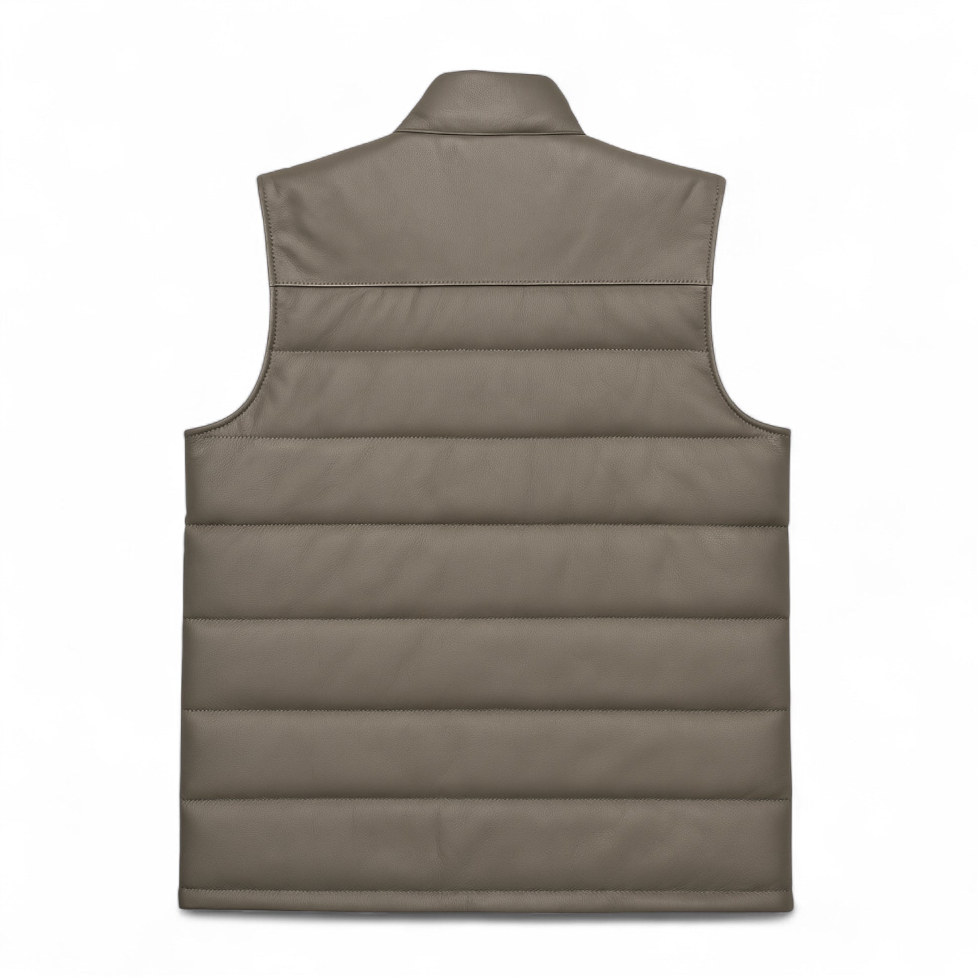 A stylish, sleeveless puffer leather vest in a muted taupe colour, featuring a sleek design with a high collar and two side pockets, perfect for layering in cooler weather.