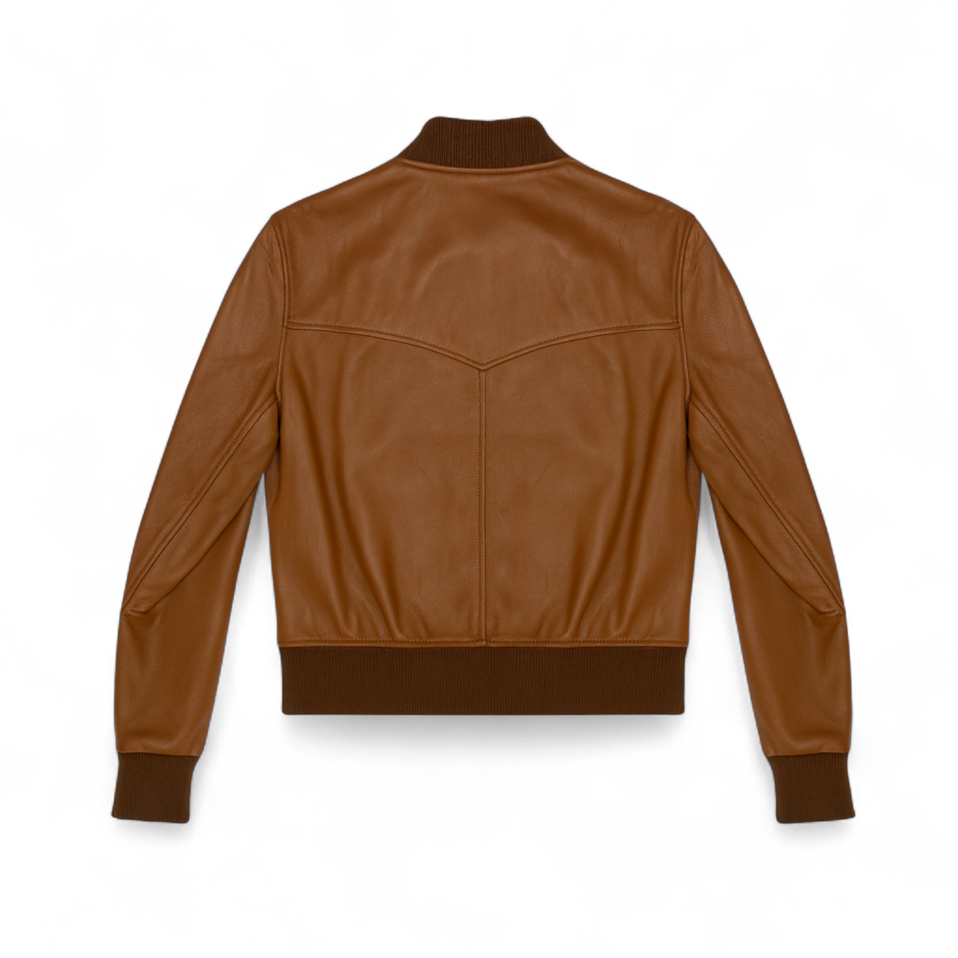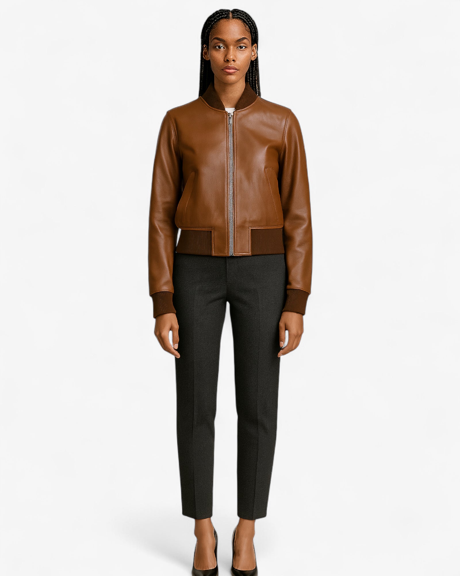 A stylish leather bomber jacket featuring a zip front, ribbed cuffs, and a classic collar, perfect for adding a touch of sophistication to any outfit.