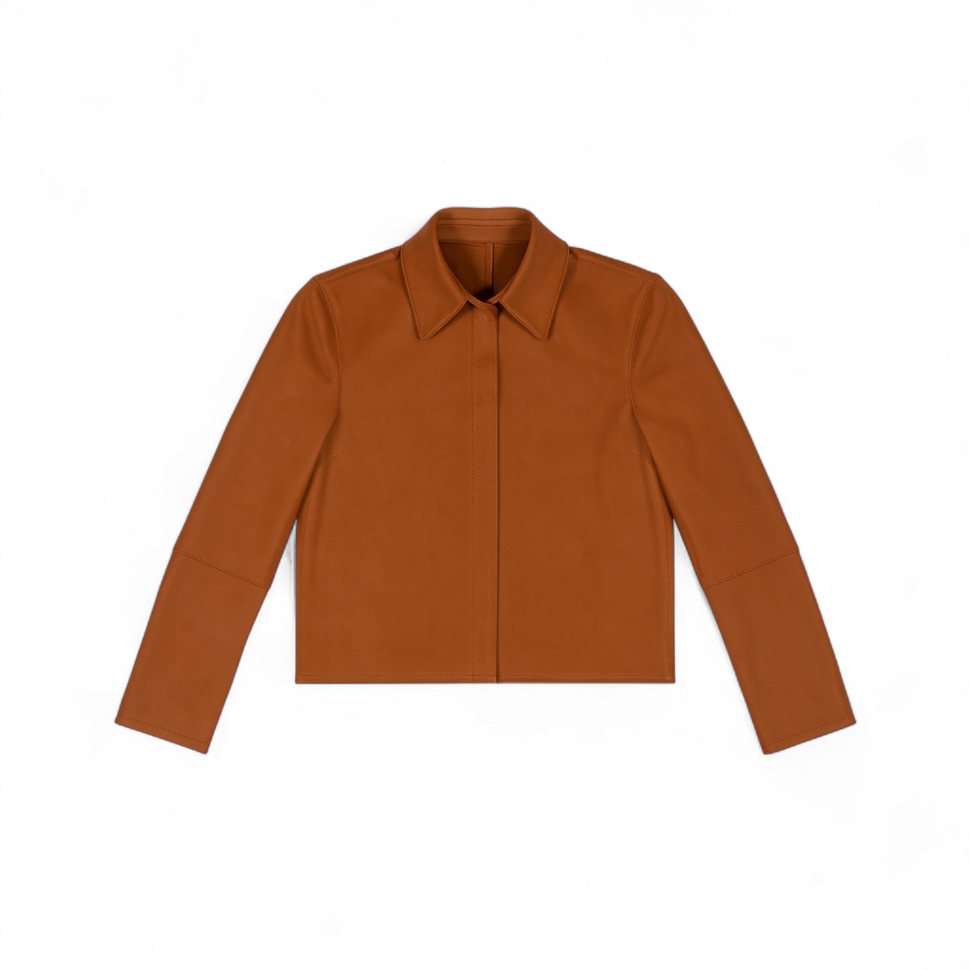 A stylish cropped brown leather jacket featuring a classic collar and long sleeves, perfect for adding a touch of sophistication to any outfit.