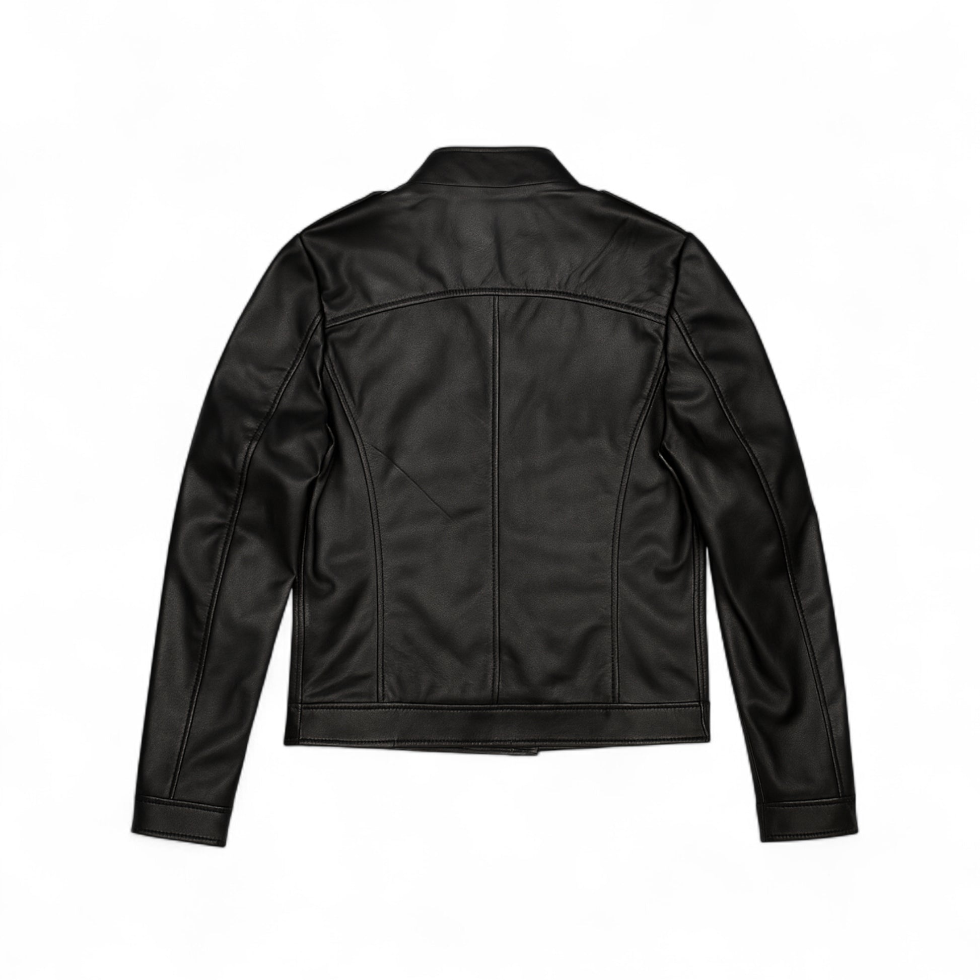 A stylish black leather jacket featuring a unique military-inspired design, complete with decorative buttons and a structured silhouette, perfect for adding a bold touch to any outfit.