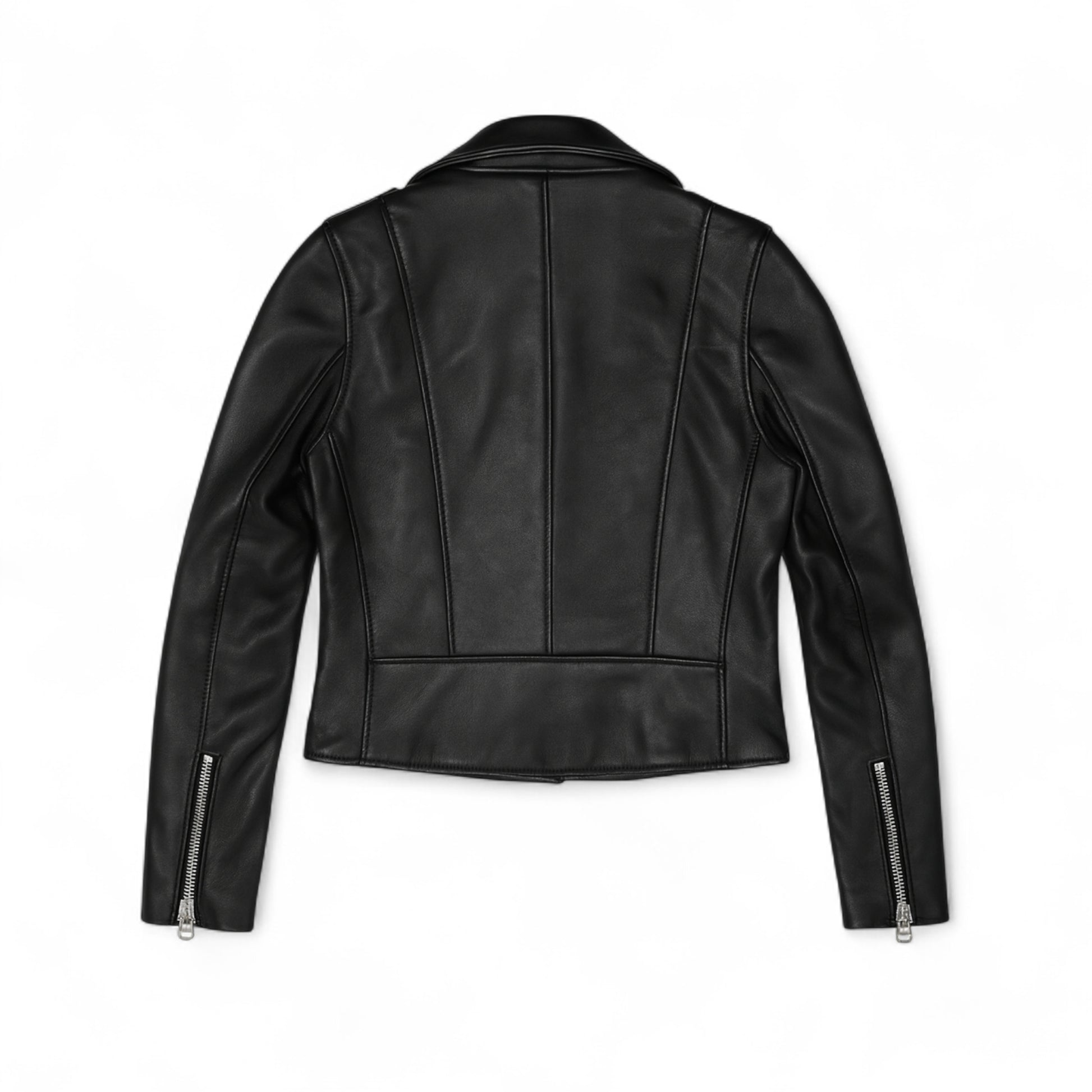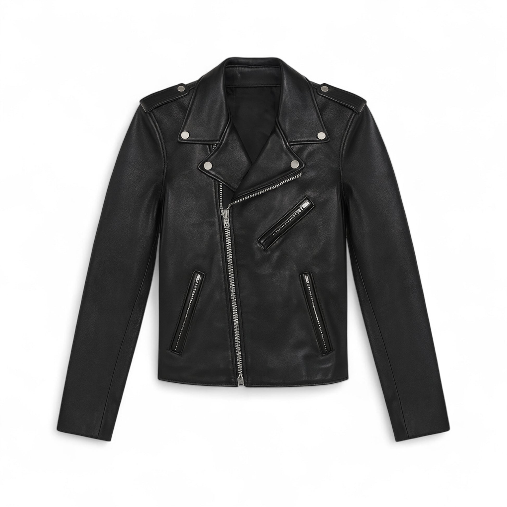 A classic black leather biker jacket featuring a stylish asymmetrical zip, multiple zippered pockets, and shoulder epaulets, perfect for adding an edgy touch to any outfit.